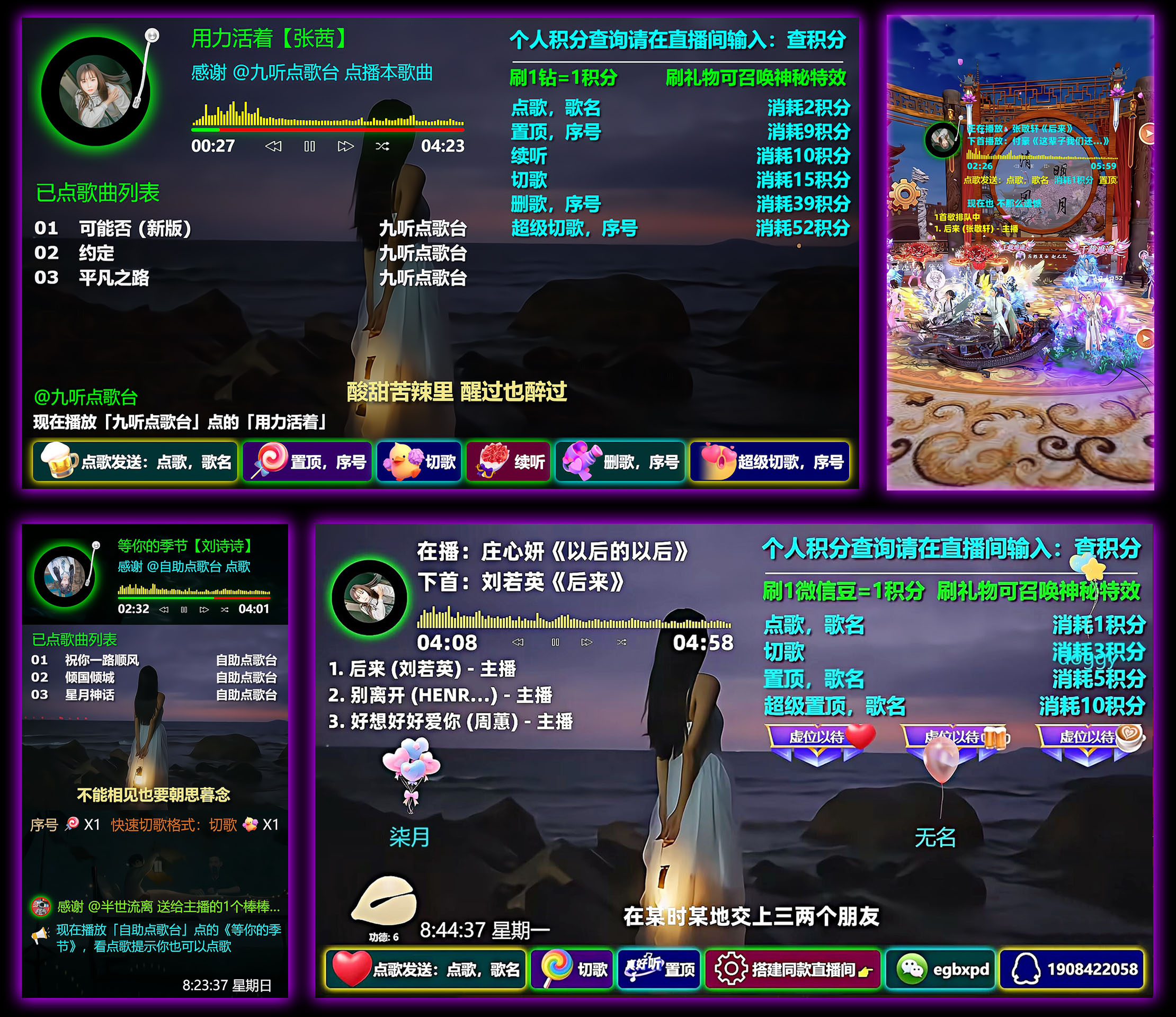 在教程开始之前,我先把各种直播间样式先给大家展示,每个人喜欢的样式不一样,因此,我们直接把所有的直播间样式都给大家做好了,有横版直播间、竖版直播间、7宫格直播间、9宫格直播间、10宫格直播间(又称双主咖直播间)、FM电台直播间,我一一做了截图,请先大致欣赏一下,然后我们开始进入搭建教程。